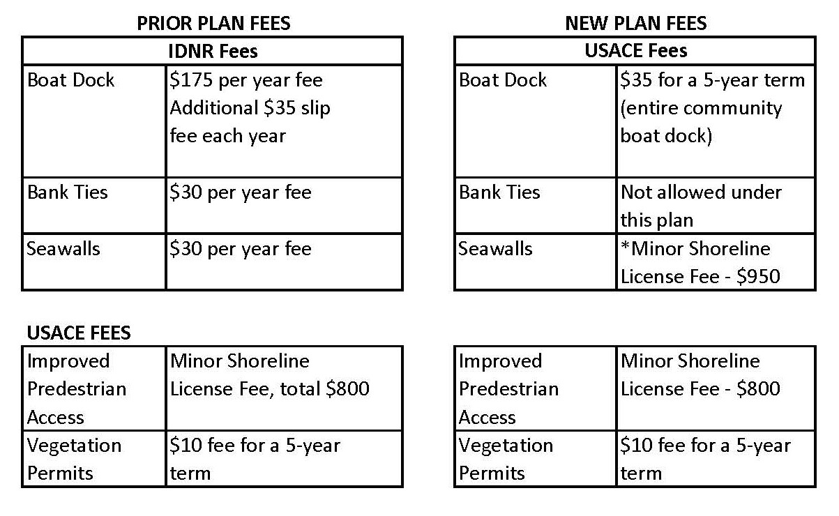 - New Applications: USACE will issue new seawall licenses and community dock permits based on the new requirements described in the updated shoreline management plan. These requirements can be found in Sections 10 and 16 of the updated plan. All Indiana Department of Natural Resources bank ties/mooring permits will be honored through 2025. Beginning Jan. 1, 2026, all bank ties/mooring permits will no longer be valid, and boats will need to be moored to a seawall or community dock after this date.