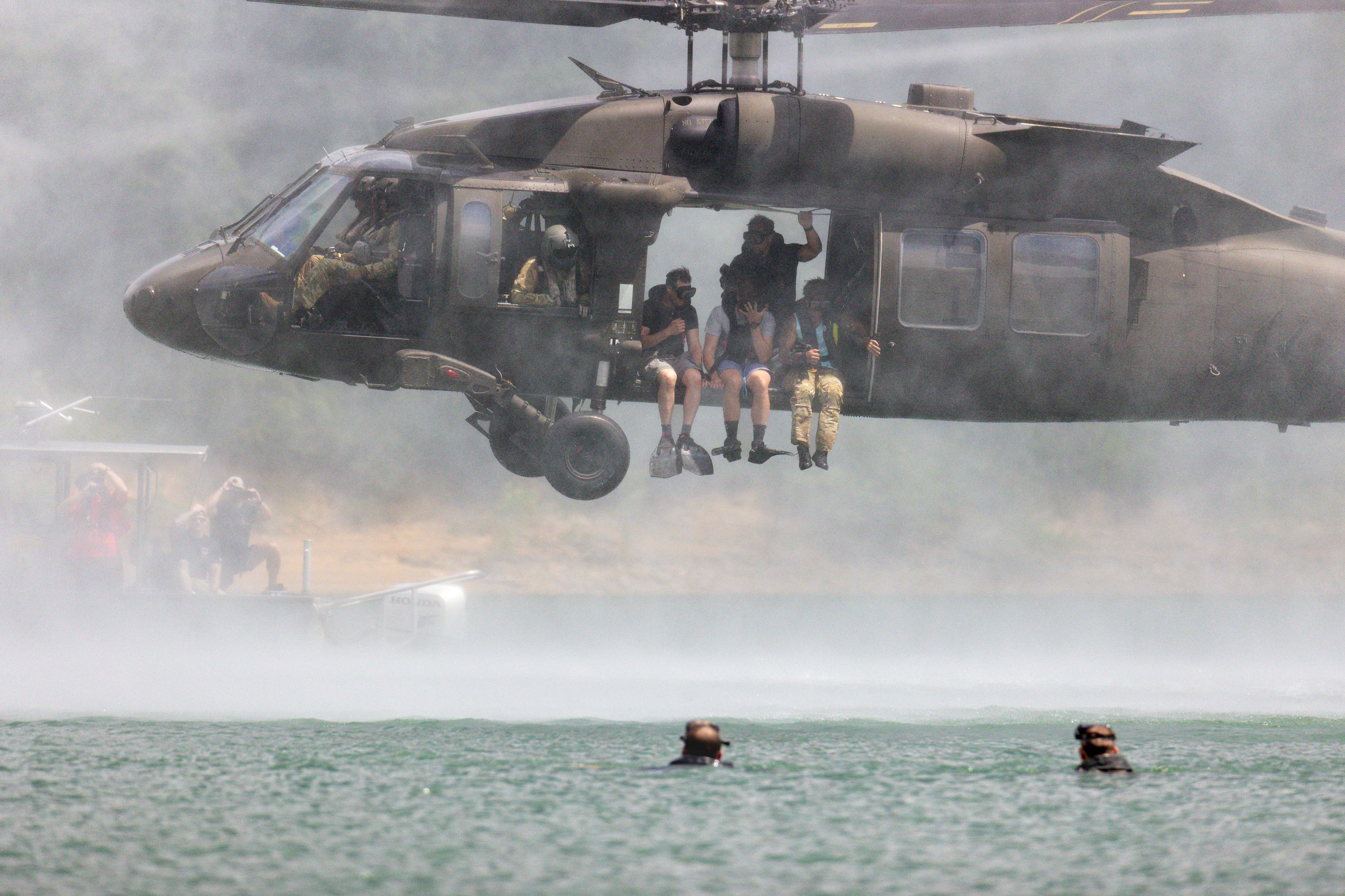 West Virginia National Guard Ridge Runner exercise participants prepare to exit a UH-60 Blackhawk above Tygart Lake during a military-operations rehearsal in Grafton, West Virginia, July 16, 2025. Authorized by the Rivers and Harbors Act of 1935, Tygart Dam was the first of 16 flood-control projects constructed in the U.S. Army Corps of Engineers Pittsburgh District. The dam provides flood protection for the Tygart River Valley and for the Monongahela and upper Ohio rivers, and has prevented more than $1.3 billion in flood damages since its construction in 1938. In addition to flood control, Tygart Dam is authorized for to support river navigation and water supply missions. During the summer and fall low-water season, Tygart Dam releases additional water downstream to meet navigation water supply requirements on the Monongahela and upper Ohio rivers. The increased flow also improves water quality and quantity for domestic and industrial use, recreation, and aquatic life. (U.S. Army Corps of Engineers photo by Andrew Byrne)